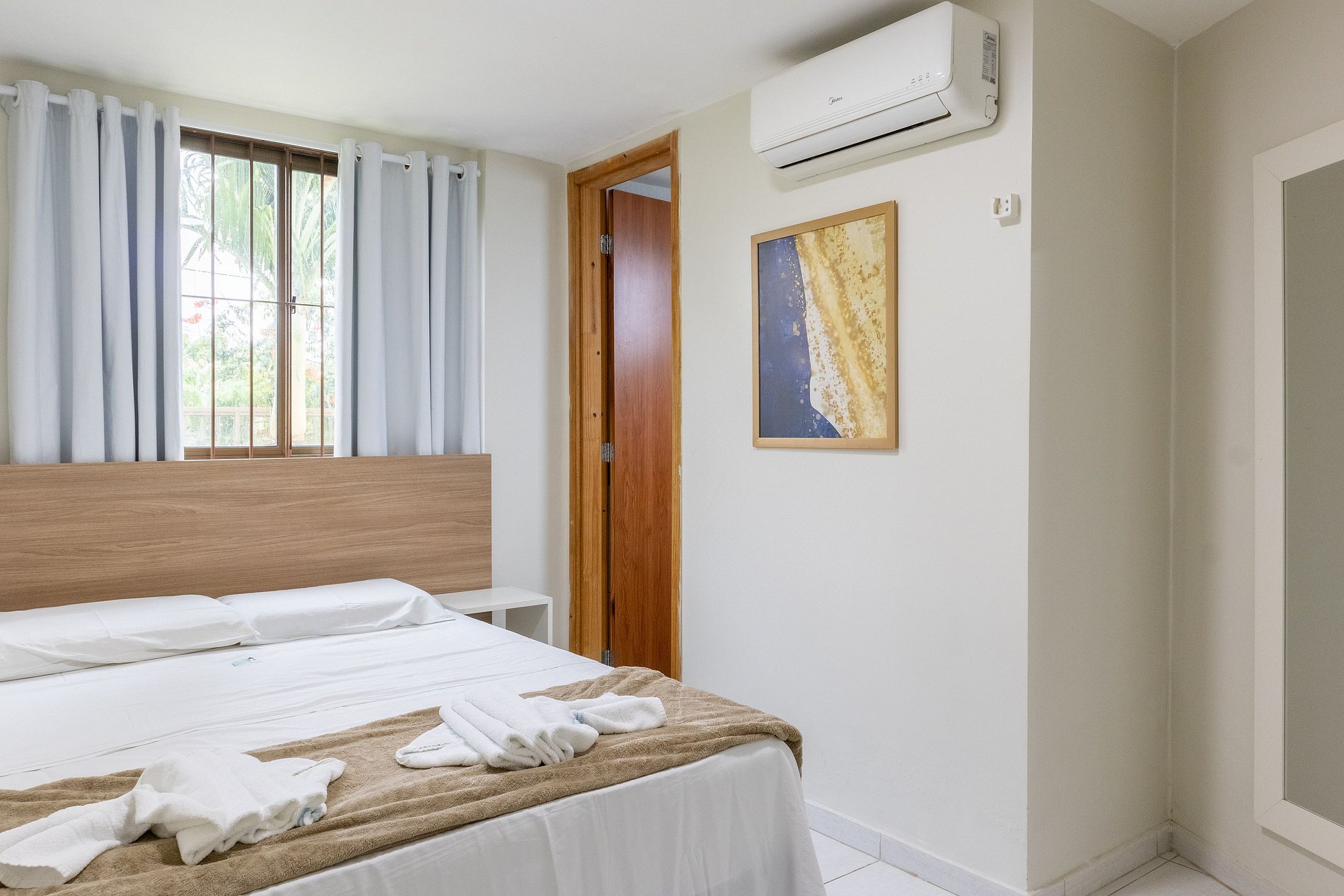 Possuímos enxoval de cama e banho, fornecemos 1 muda por hóspede, não havendo troca ou reposição durante a estadia.